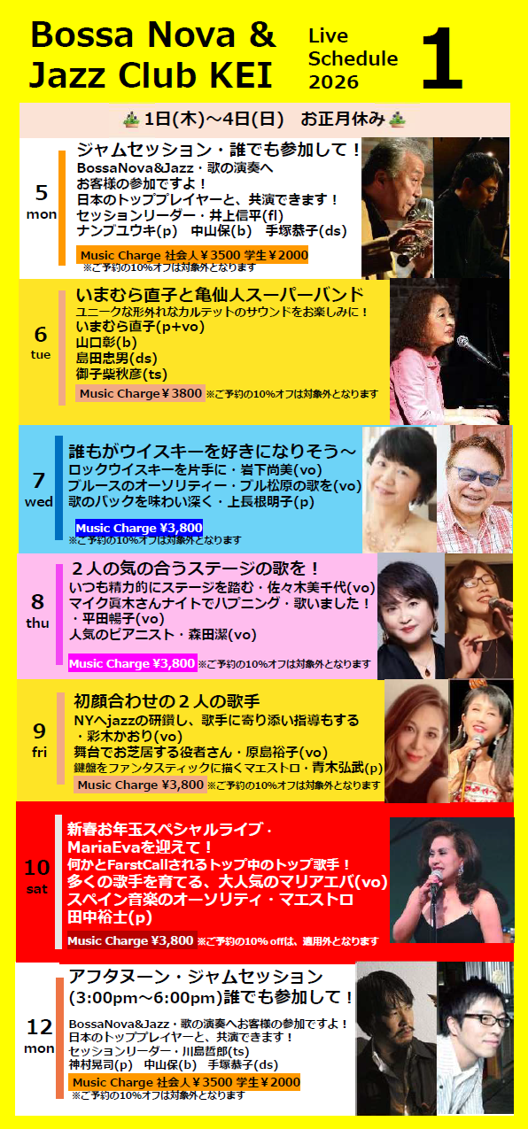 26th (Mon): “Jam Session” Join us and perform with some of Japan’s top musicians! Session Hosts: Eiji Taniguchi (cl), Koji Kamimura (p), Norifumi Nagamatsu (b), Kyoko Tezuka (ds)