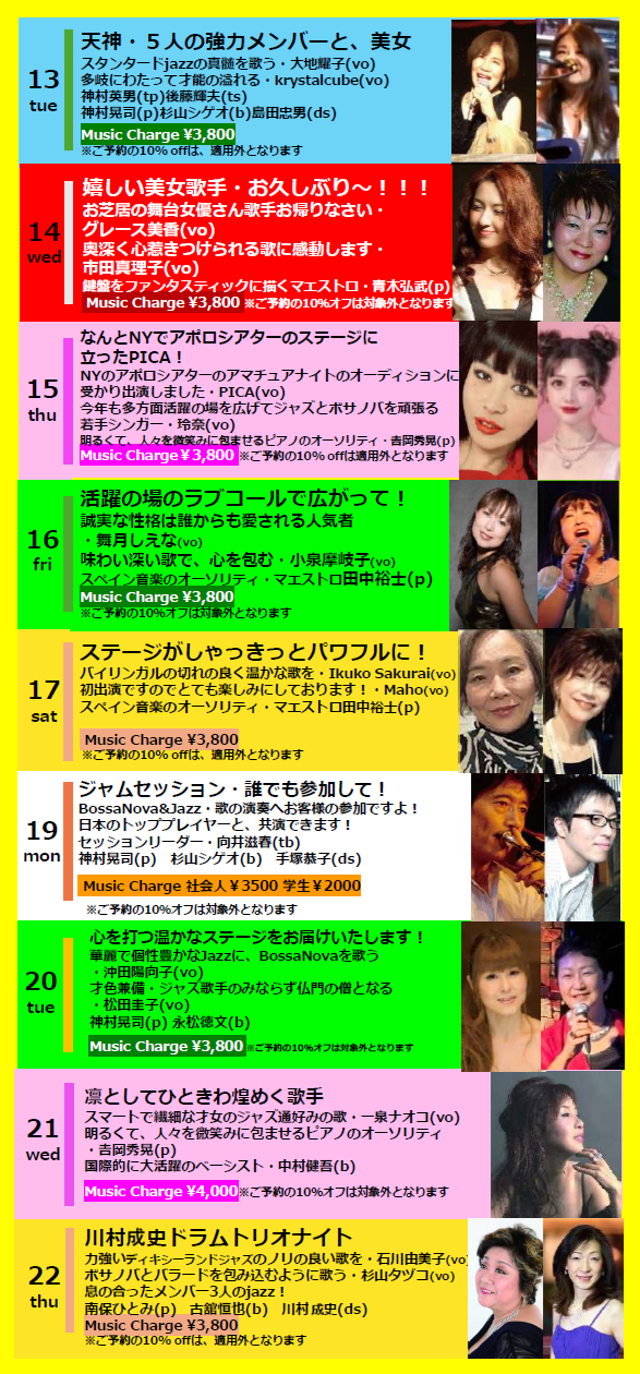 13th (Tue): “Tenjin Quintet” Guest Vocals: Yoko Daichi & Krystal Cube; Hideo Kamimura (tp), Teruo Goto (ts), Koji Kamimura (p), Shigeo Sugiyama (b), Tadao Shimada (ds)