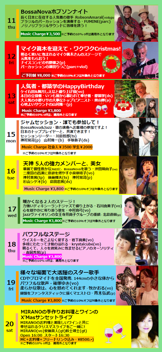 MIRANOのお料理と美味しいワインと共に幸せ溢れるクリスマスライブをご一緒に!