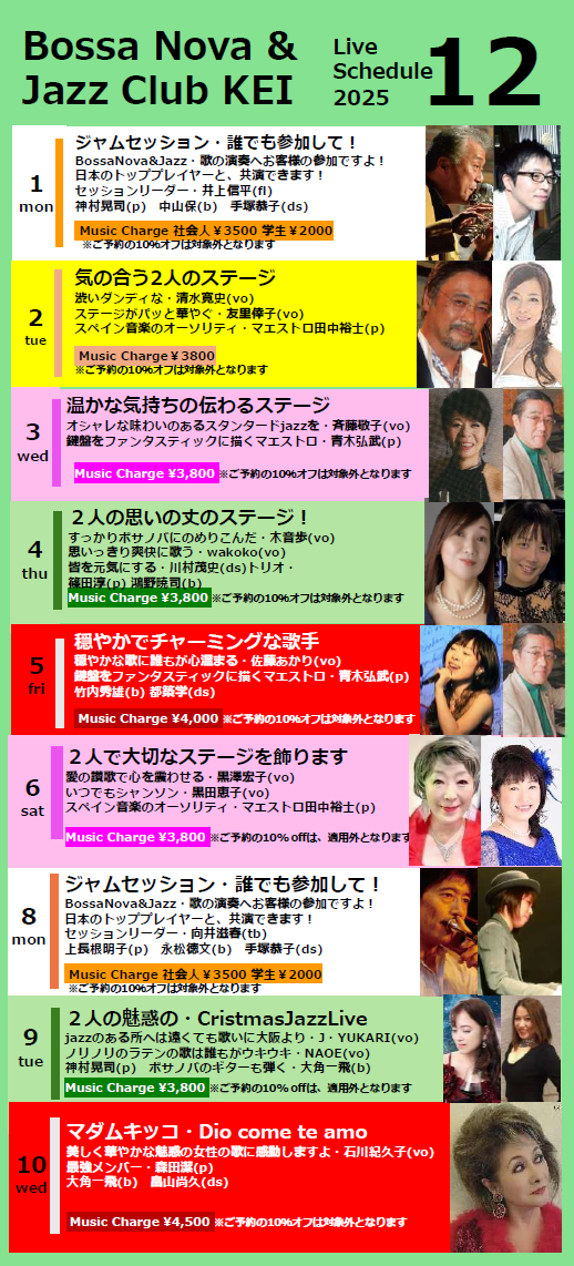 9th (Tue): “A Enchanting Christmas Jazz Live for Two” From Osaka: J. YUKARI & Latin specialist NAOE (vo), Koji Kamimura (p), Kazuto Osumi (b)