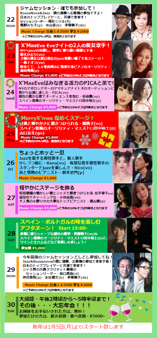 24th (Wed): “Christmas Eve” PICA (vo) bringing her New York Apollo Theater’s Amateur Night experience & Kaoru Itaya (vo) and Maestro Hiroshi Tanaka (p).